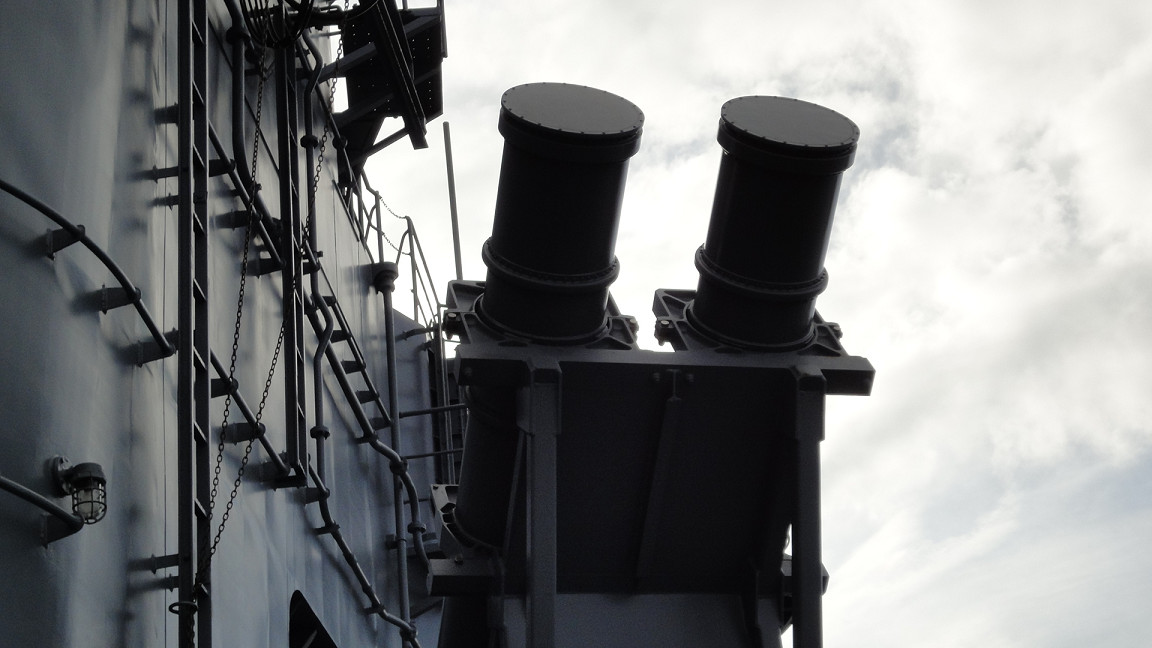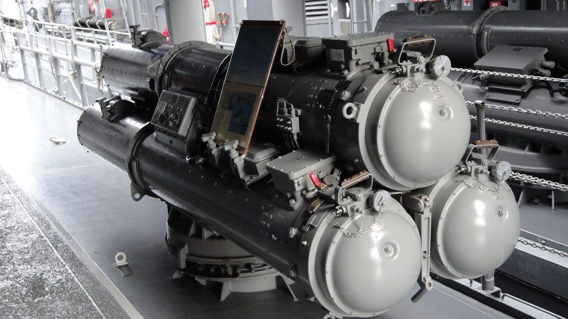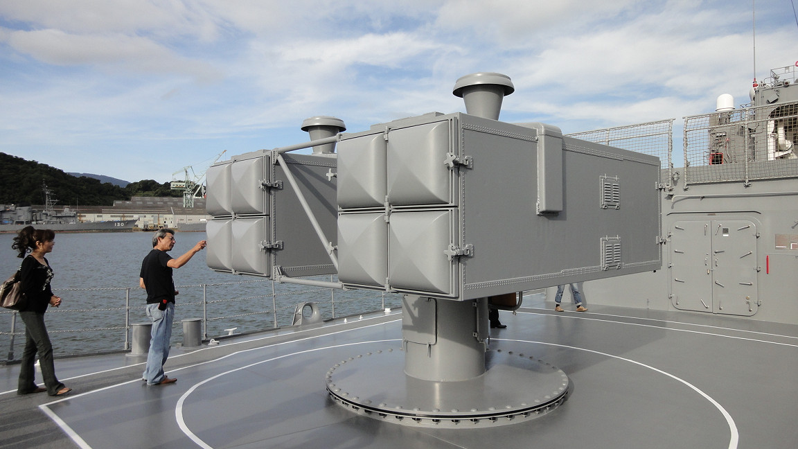 左から三連装魚雷、ハープーン(対艦ミサイル)、対空ミサイル。